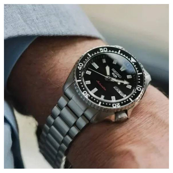 Orologio da uomo ispirato alle linee storiche della serie SKX, con cassa da 42,5 mm con ghiera girevole con inserto in vetro e bel bracciale a maglie piene in acciaio. Monta movimento meccanico automatico 4R36 con datario day-date su quadrante soleil nero con indici applicati e sfere lumibrite. Corona a ore 4, fondo a vista e impermeabilità di 100 metri