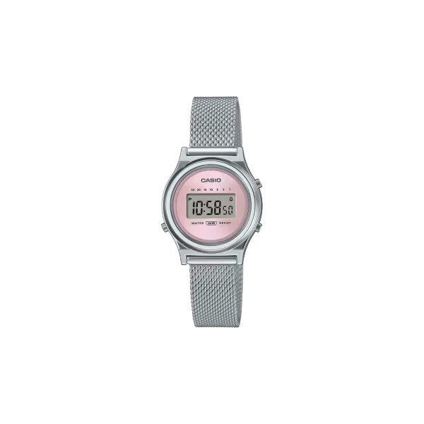 Piccolo orologio da donna della linea vintage con cassa in resina argentata di forma rotonda da 26 mm e bracciale in acciaio maglia milano. Monta movimento digitale a batteria con funzione di sveglia, cronometro e timer su display grigio con contorno rosa. Water resistant.